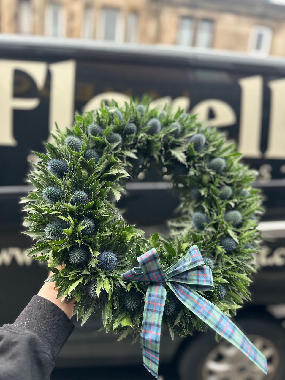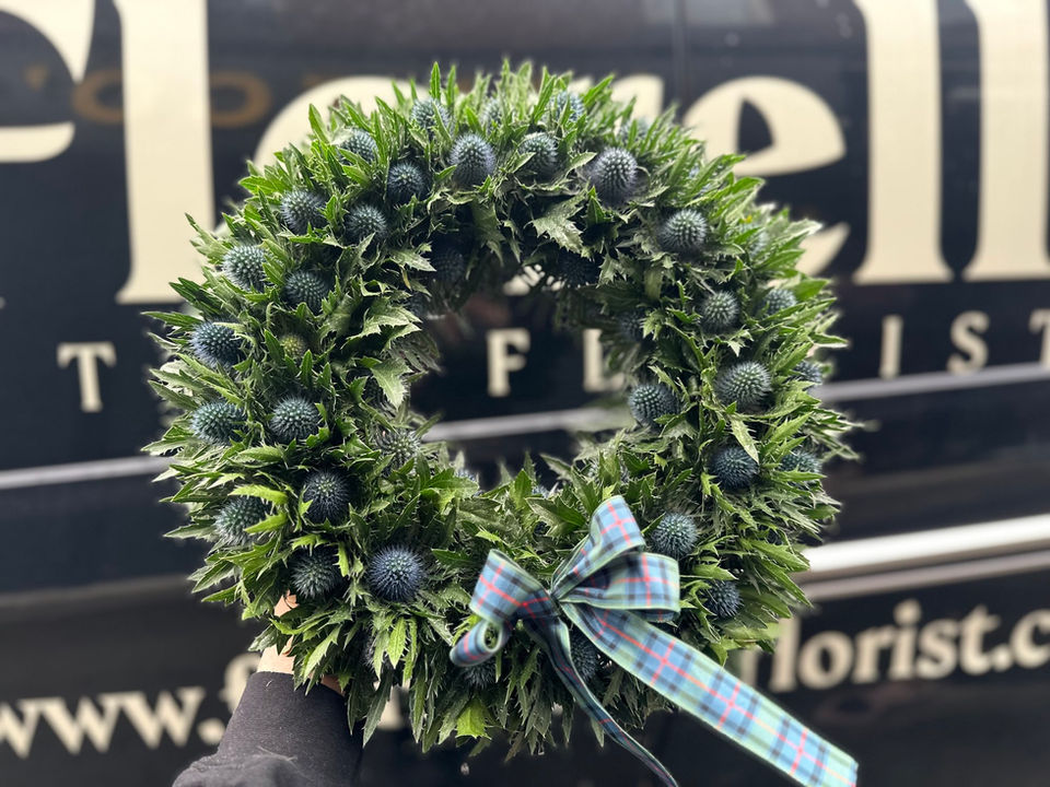 12inch wreath with beautiful blue thistles and a tartan ribbon. Scottish Funeral tribute for a gentleman with a touch of class